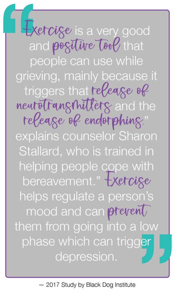 A 2017 study by Black Dog Institute found regular exercise of any intensity can help prevent depression—and just one hour a week can help. Losing a loved one is emotionally draining, and grief can take away energy and focus. Engaging in exercise can help clear the mind and bring a feeling of calmness. It can also motivate people to do other things to get back into society and reintegrate them into life.