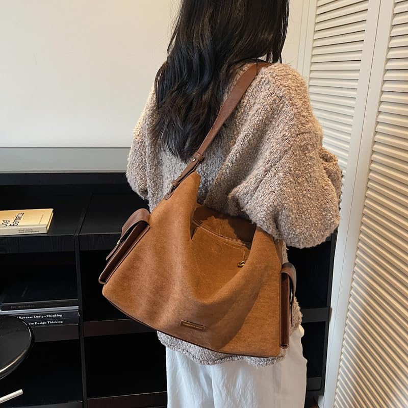 HOT ! Slouchy Hobo Bag for Women, Faux Suede Satchel Tote Bag, Large Brown Purse with Compartments