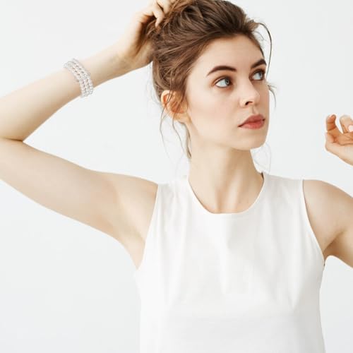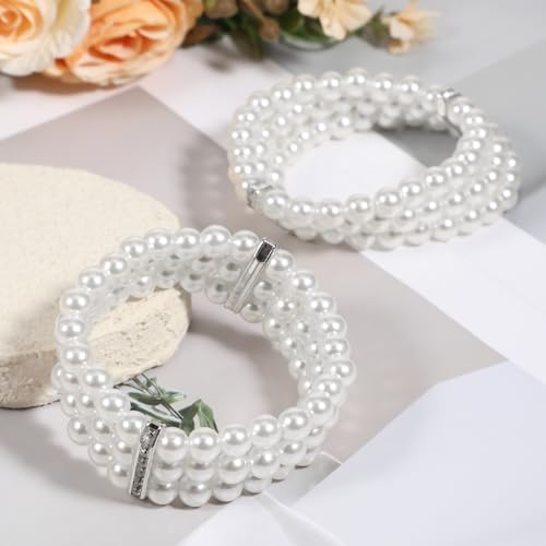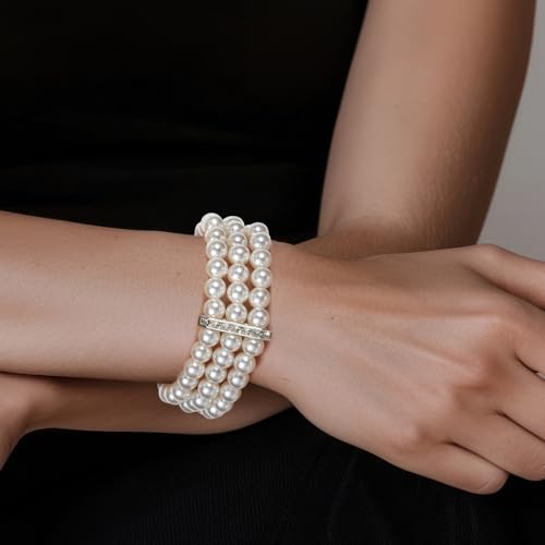 • PREMIUM QUALITY MATERIALS: Our fake pearl bracelet is meticulously crafted from high-quality ABS, glass, and zinc alloy. The 3 rows faux pearls accent white stretch wrist bracelet features durable elastic rope, ensuring a comfortable fit for most wrist sizes. The white pearl bracelet is both elegant and beautiful, perfect for dinner dresses and casual dressing.