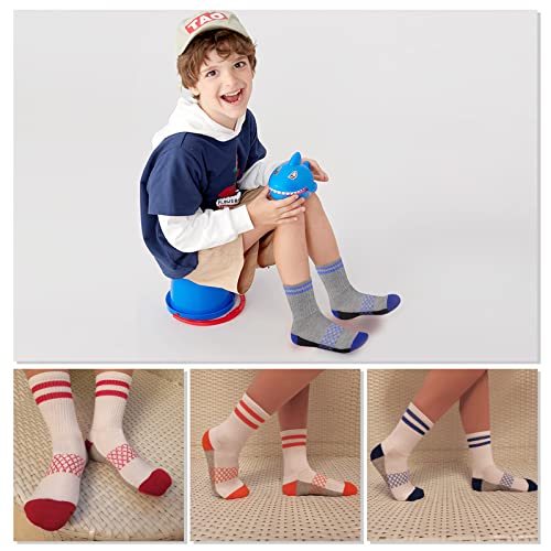 Fabric type: 75% cotton, 22% polyester and 3% spandex. Small: shoe size 3-7 (3-4 years); Medium: shoe size 7.5-1 (4-7 years); Large: shoe size 1.5-7.5 (7-10 years).Care instructions: Machine WashOrigin: ImportedPattern: StripedMATERIAL - Our boys crew socks made of premium cotton are cozy, durable, breathable and smooth against your boy's feet.ELASTICITY & RIBBED SUPPORT - Boys calf socks with stretchable cuff ensures a great fit, not too tight and hold up well. Ribbed support makes it convenient to wear and take off, no slipping and no bunching.CUSHIONED SOLE - Half padded athletic socks for boys provide shock absorption and protection in high wear areas, also give superior comfort and soft when running and playing sports.ARCH SUPPORT & REINFORCEMENT - Kids sports stripe socks with embedded arch support reduce foot fatigue and keep the socks in place. Reinforced toes and heels ensure long-last durability.OCCASION - Cotton children socks are ideal for sports and leisure, such as football, baseball, basketball, hiking and so on. Crew design is perfect for athletic or casual wear. Perfect for everyday use. top-grade materials and excellent craftsmanship ensure long-lasting durability.