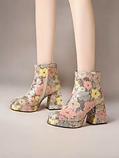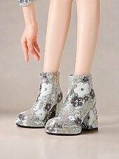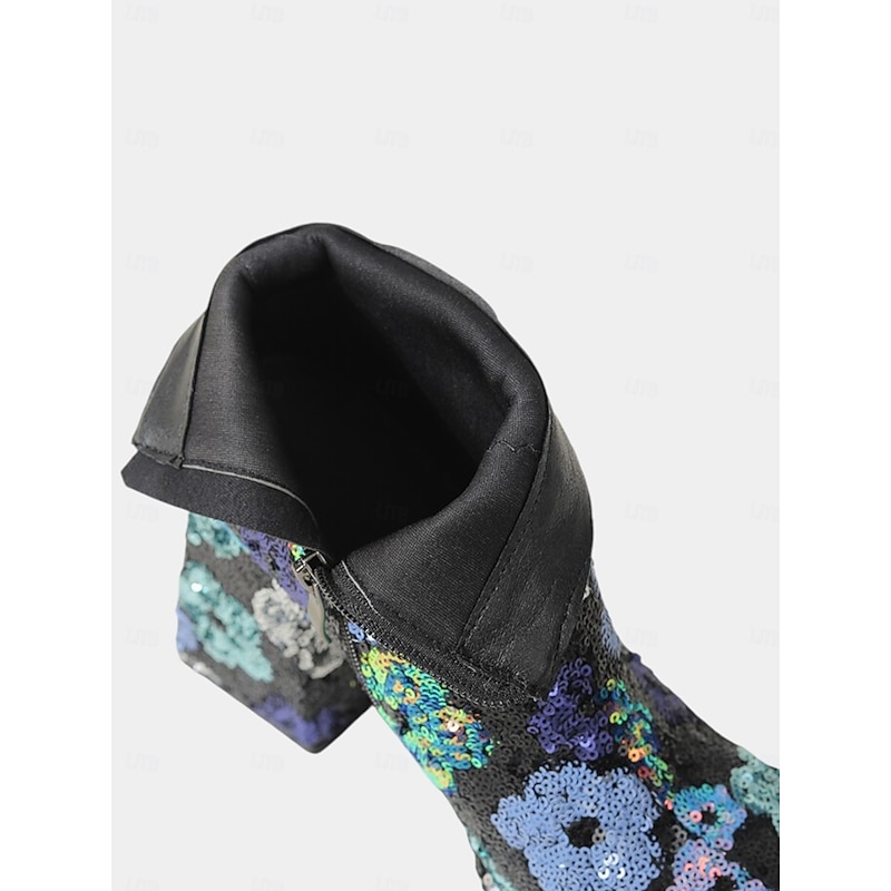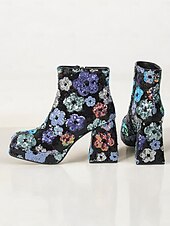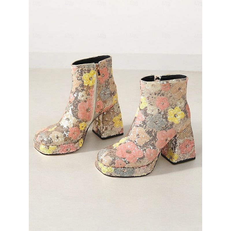 Highlights [Fabric and Design] : These Women's Sequin Floral Ankle Boots are crafted with a stunning blend of sparkling glitter and synthetic leather, making them a durable yet stylish choice for any wardrobe. The vibrant floral design is adorned with multicolored sequins, creating a dazzling effect that catches the eye. [Fit and Style] : Featuring a platform block heel, these boots offer both stability and comfort without sacrificing height, making them ideal for those who seek style without compromising on practicality. The easy-to-use side zipper ensures a snug fit and effortless wear. [Design Highlights] : These boots stand out with their intricate sequin embellishments and metallic floral patterns, adding a touch of glamour to any outfit. The round toe shape complements the punk style, making them a versatile choice for fashion-forward individuals. [Occasions] : Perfect for parties, events, and other special occasions where making a fashion statement is a must. Whether it’s a glamorous night out or a lively gathering, these boots add charm and style to any ensemble. [Size Recommendation] : Available in a range of sizes from US5.5 to US10.5, these boots are designed to fit standard sizing. Please select your usual size for the best fit.