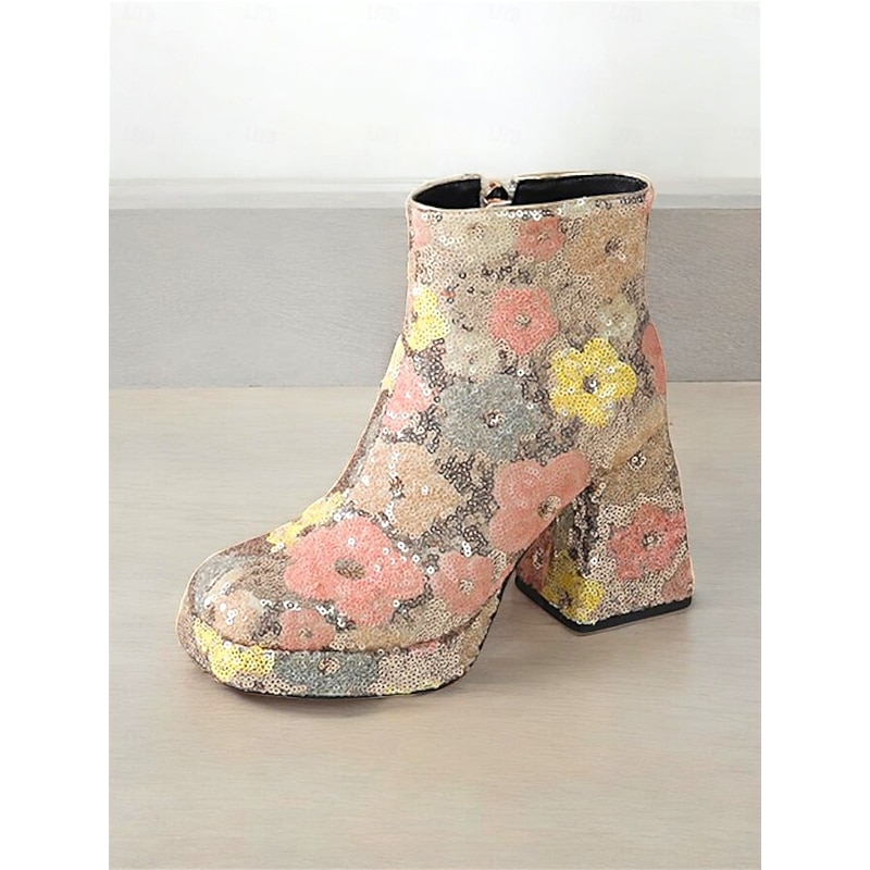 Women's Sequin Floral Ankle Boots – Glittering Platform Block Heels for Parties and Events 1