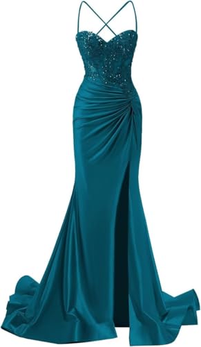 More information about Women Mermaid Beads Prom Dress with Slit Satin Bridesmaid Dresses Long Spaghetti Strap Evening Formal Party Gown