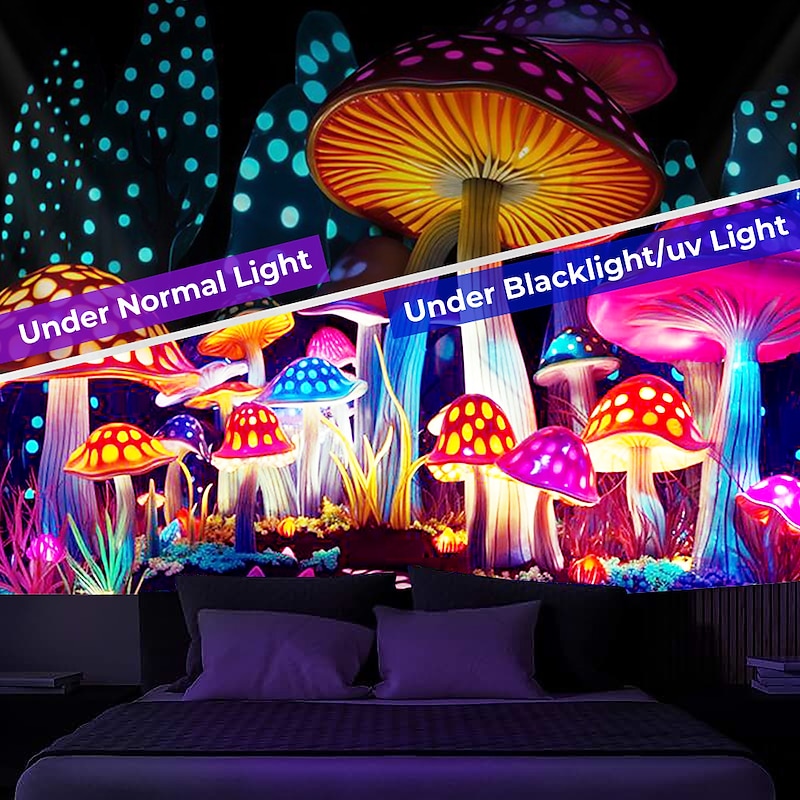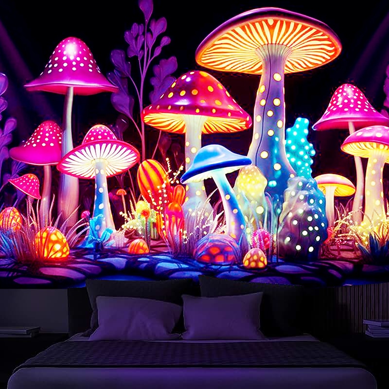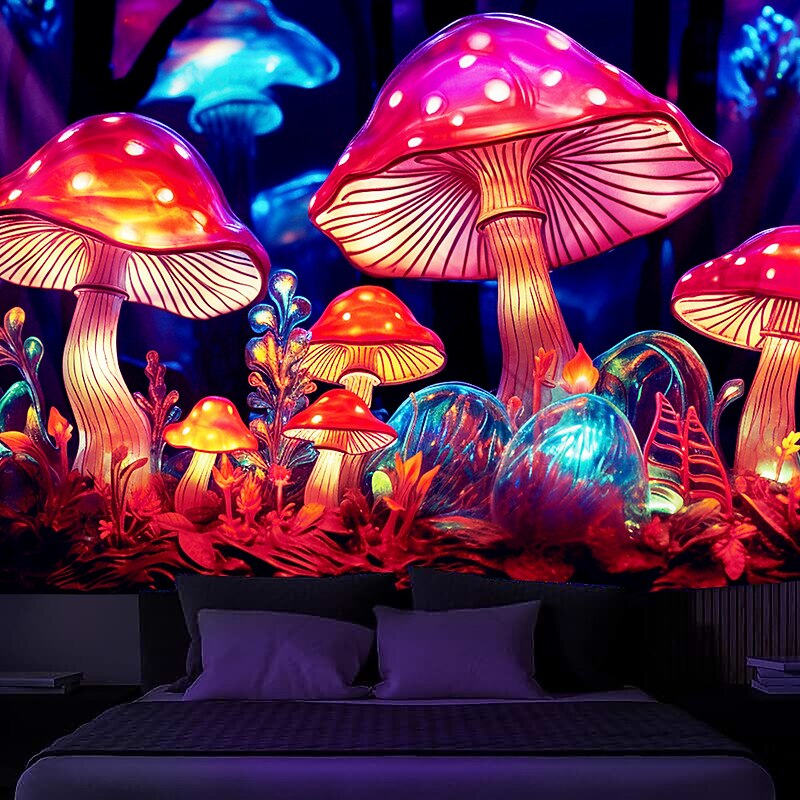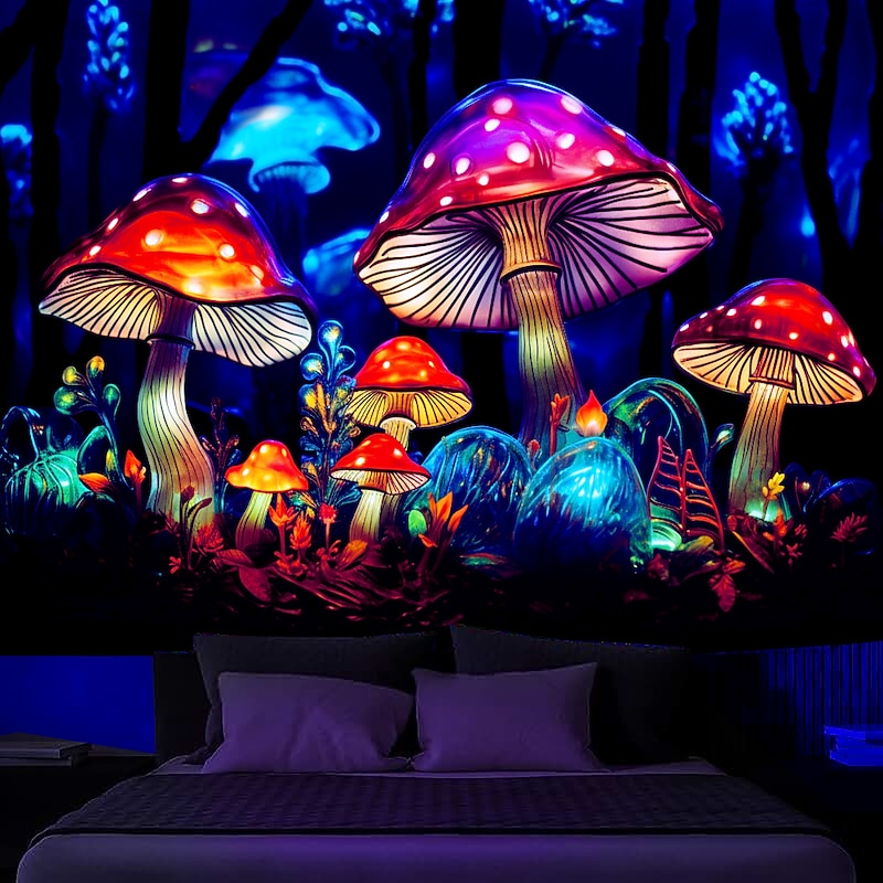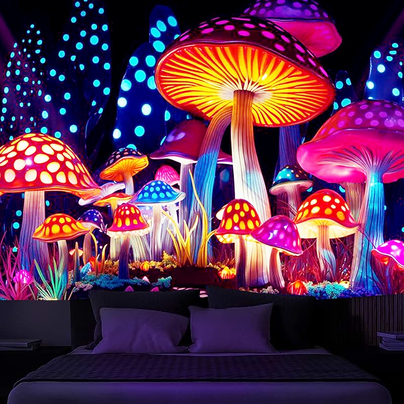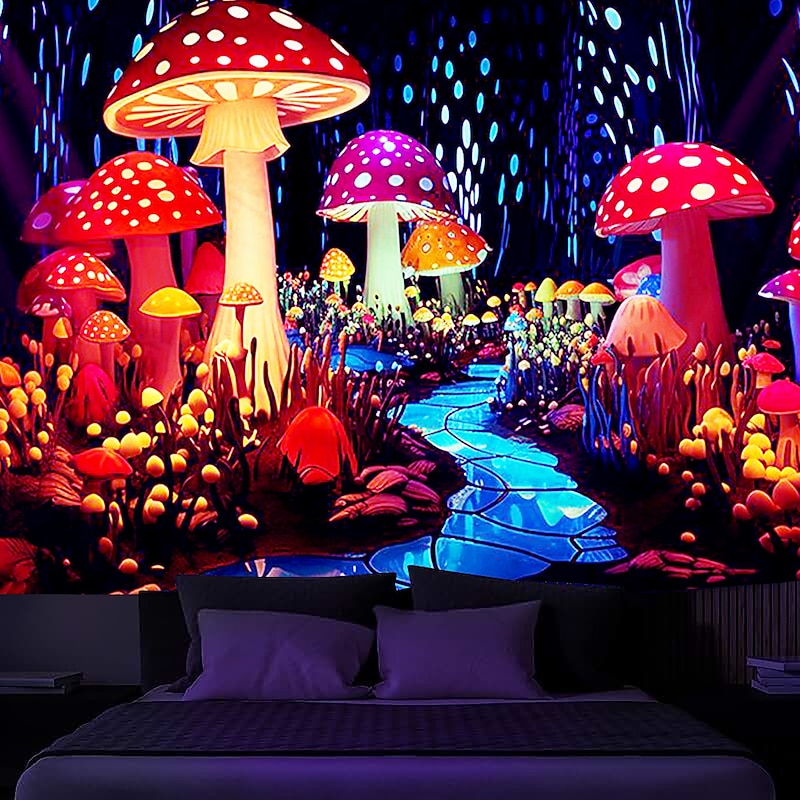 HOT ! Mushroom Fantasy Blacklight Tapestry Glow in the Dark Glow Party UV Reactive Trippy Misty Nature Landscape Hanging Tapestry Wall Art Mural for Living Room Bedroom