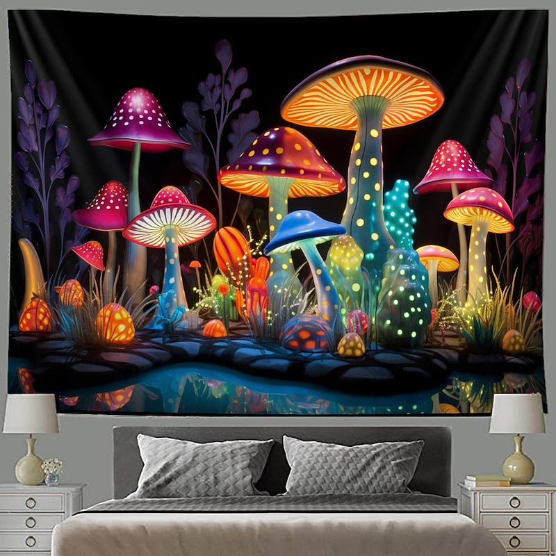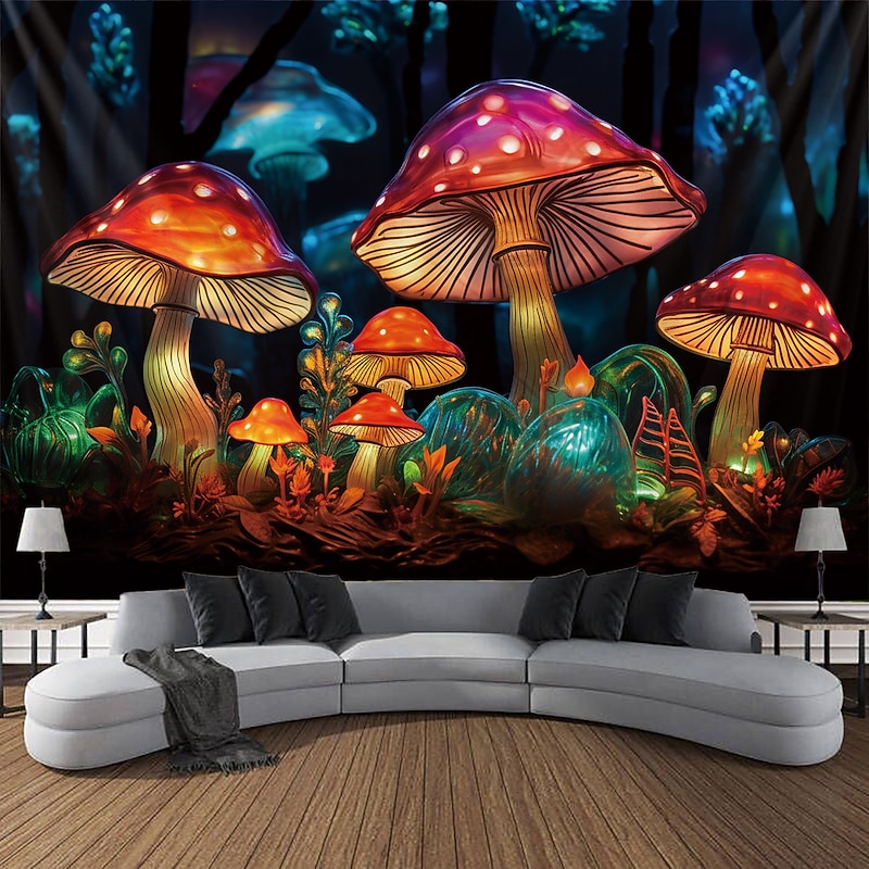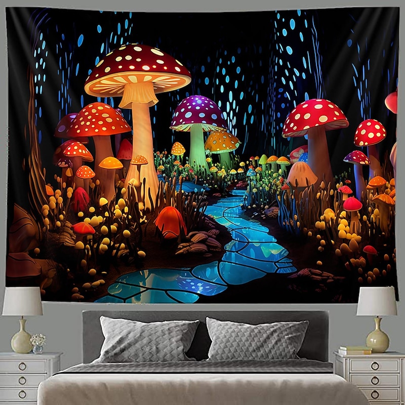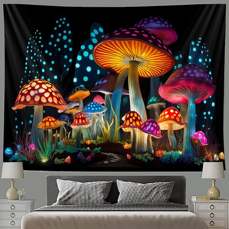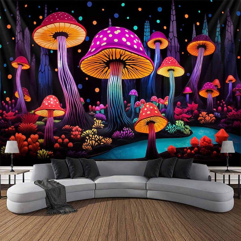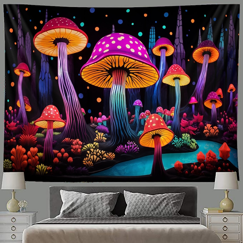 HOT ! Mushroom Fantasy Blacklight Tapestry Glow in the Dark Glow Party UV Reactive Trippy Misty Nature Landscape Hanging Tapestry Wall Art Mural for Living Room Bedroom
