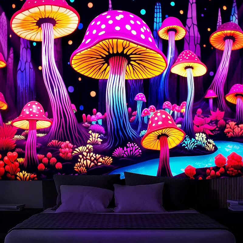 Mushroom Fantasy Blacklight Tapestry Glow in the Dark Glow Party UV Reactive Trippy Misty Nature Landscape Hanging Tapestry Wall Art Mural for Living Room Bedroom 45