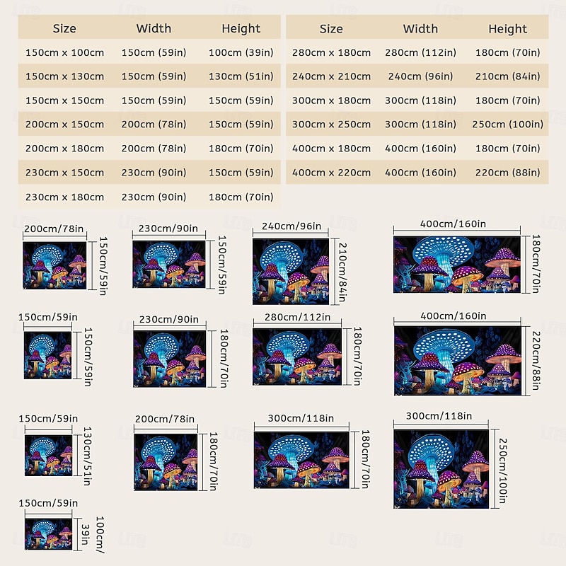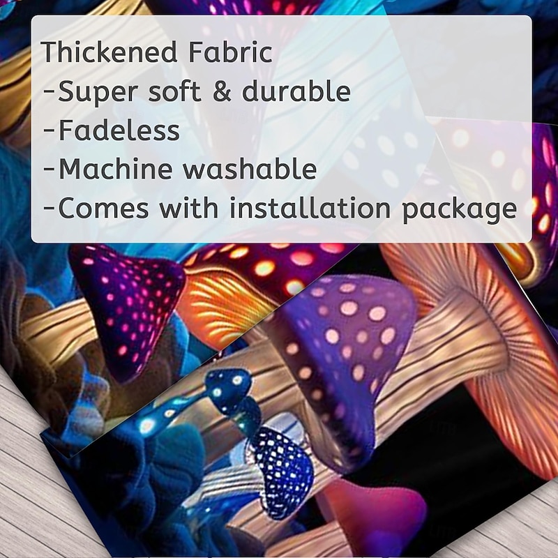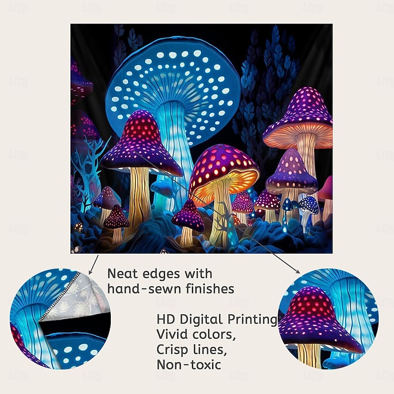 Highlights 【Durable Construction】 Crafted with high-quality polyester fabric, this tapestry is built to last. Its robust composition ensures that you can enjoy its beauty for years to come. 【Soft and Lightweight】 This tapestry is soft to the touch and lightweight, making it perfect for both indoor and outdoor use. 【Multiple Size Options】 Available in different sizes to accommodate any room's dimensions. 【Intricate Design】 The tapestry features a captivating design inspired by life itself. Its vivid imagery, crisp lines, and vibrant colors will become a conversation piece in any room. 【Versatility at Its Best】 Not just for wall decor, this tapestry can also double as a tablecloth or a picnic blanket, adding functional versatility to its artistic charm. 【Note】 1. Please allow 1-2cm (0.4"-0.8") deviations due to manual measurement. 2. Please understand the tiny color vary from the product due to different light and screen display. 3. UV/Black Light Reactive: This glow in the dark tapestry glows under blacklight / UV light. In normal light, the colors also are full and vivid.