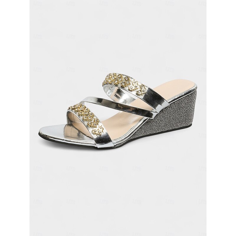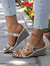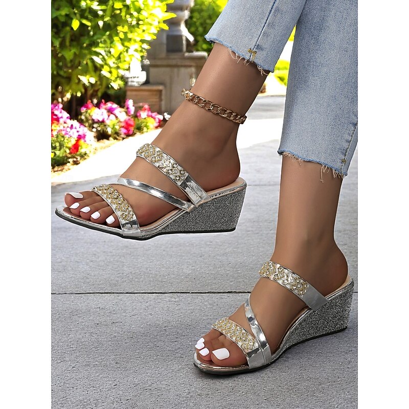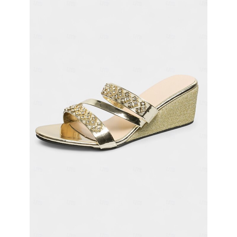 HOT ! Women's Metallic Gold Wedge Sandals with Rhinestone Straps – Trendy Open-Toe Platform Shoes for Beach Resorts and Summer Getaways