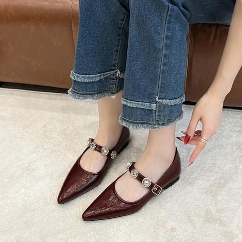 HOT ! Women's Leather Pointed Toe Mary Jane Flats Fashion Pearl Rhinestone Ankle Strap Dress Ballet Flats for Office Party Walking Formal