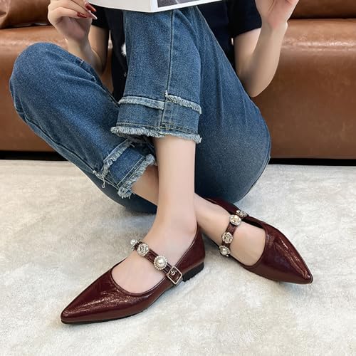 Women's Leather Pointed Toe Mary Jane Flats Fashion Pearl Rhinestone Ankle Strap Dress Ballet Flats for Office Party Walking Formal 6