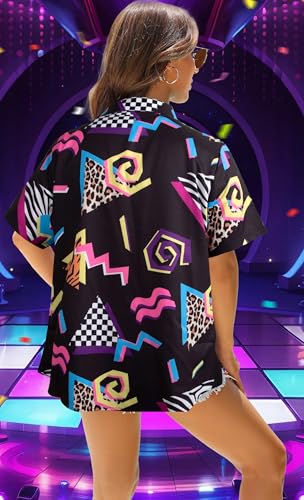 HOT ! 80s 90s Outfits for Women: 80s Disco Party Themed Shirt Vintage 90s Neon Hawaiian Button Down Short Sleeve Tops