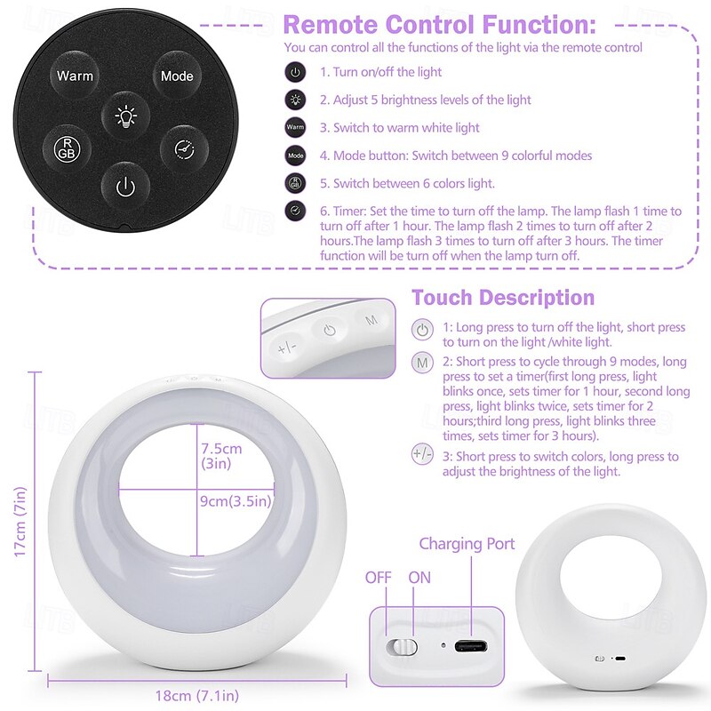 More information about 1 Pc RGB color dimming night light remote control touch dimming timer USB rechargeable battery indoor bedroom atmosphere light up night light