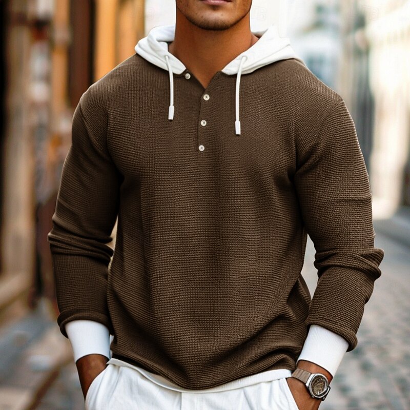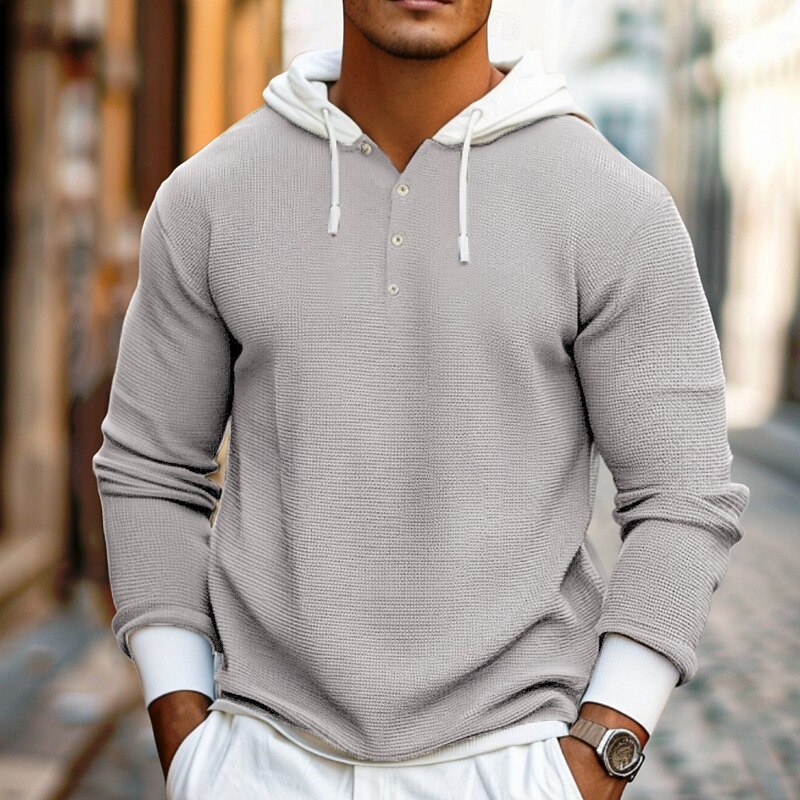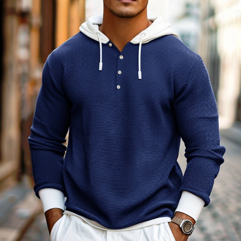 Highlights - Crafted from high-quality polyester material - Features long sleeves for added coverage and warmth - Specifically designed for men - Offers a basic and versatile style - Perfect for vacation wear - Includes a drawstring design for adjustable fit - Made in a trendy waffle knit style for added texture and dimension.