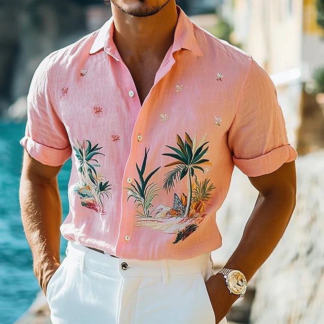 HOT ! Men's Linen Shirt Summer Shirt Beach Wear Button Up Shirt Palm Tree Vacation Holiday Pink Short Sleeve Turndown Summer Spring Clothing Apparel
