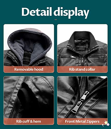 • ▶ 2 style design--Kids bomber leather jacket with removable Hooded design for different looks between stylish hooded riding jacket and casual stand collar Fall jacket.Full zip front closure, warm and convenient for kids.