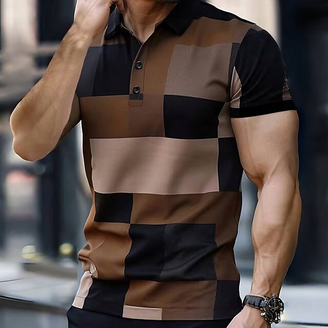 Men's Plaid Golf Shirt Short Sleeve Polo Shirts Collared Shirts Casual Vacation Wear Formal Wear Festival Wear Buttons 3D Print Summer Dark Brown Black Blue 7