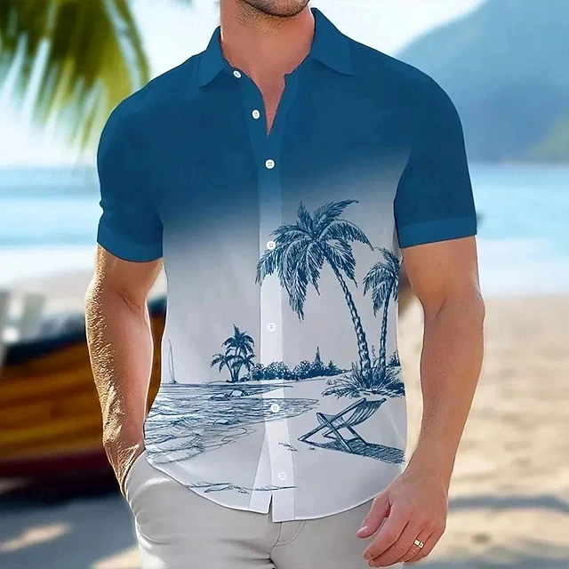 More information about Men's Coconut Tree Gradient Color Tropical Plants Summer Hawaiian Shirt Button Up Shirt Aloha Shirt Short Sleeve Hawaiian Resort Vacation Holiday Beach Wear Summer Spring Turndown Collared Shirts Blue