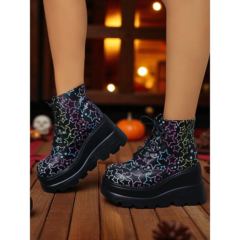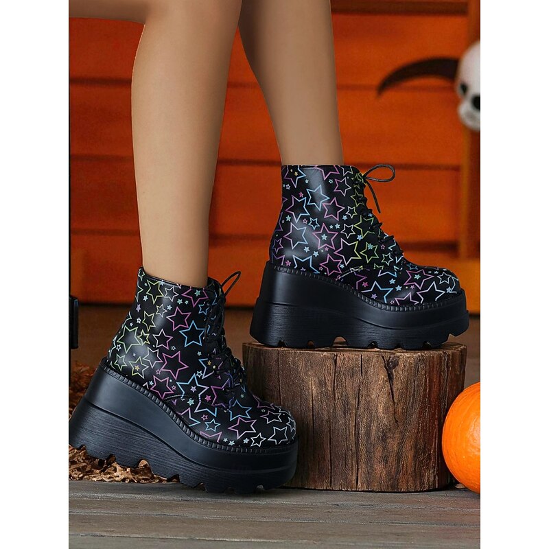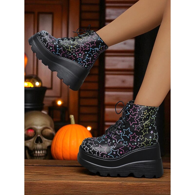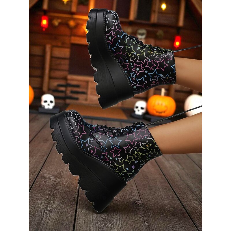 HOT ! Women's Black Platform Skull Lace-Up Boots - Halloween Chunky Sole Gothic Ankle Boots for Fall Parties, Cosplay and Day of the Dead