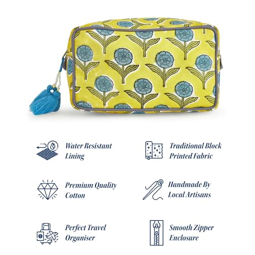 • Spacious & Stylish Design: Organize your travel essentials effortlessly with our large-capacity makeup bag. Perfect for makeup, toiletries, and skincare, its blue & yellow floral pattern adds a chic touch to your travel gear.