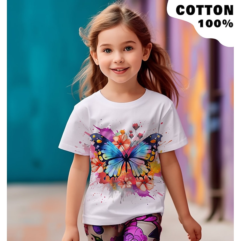 Girls' 3D Graphic Butterfly T shirt Tee Short Sleeve 3D Print Summer Spring Active Fashion Cute 100% Cotton Kids 3-12 Years Outdoor Casual Daily Regular Fit 11