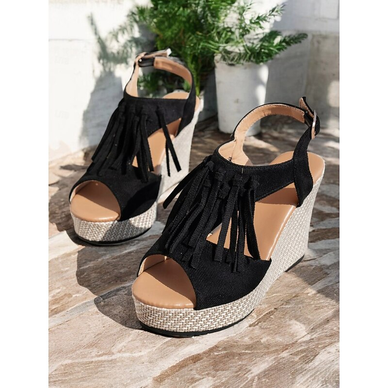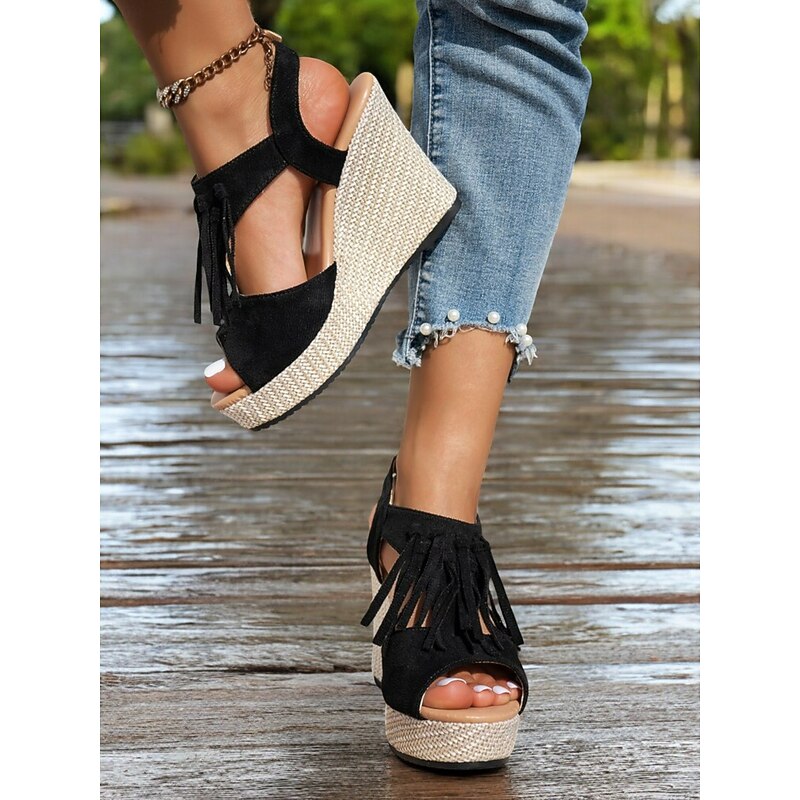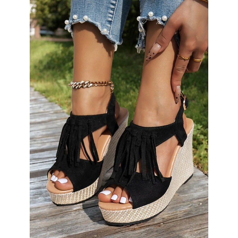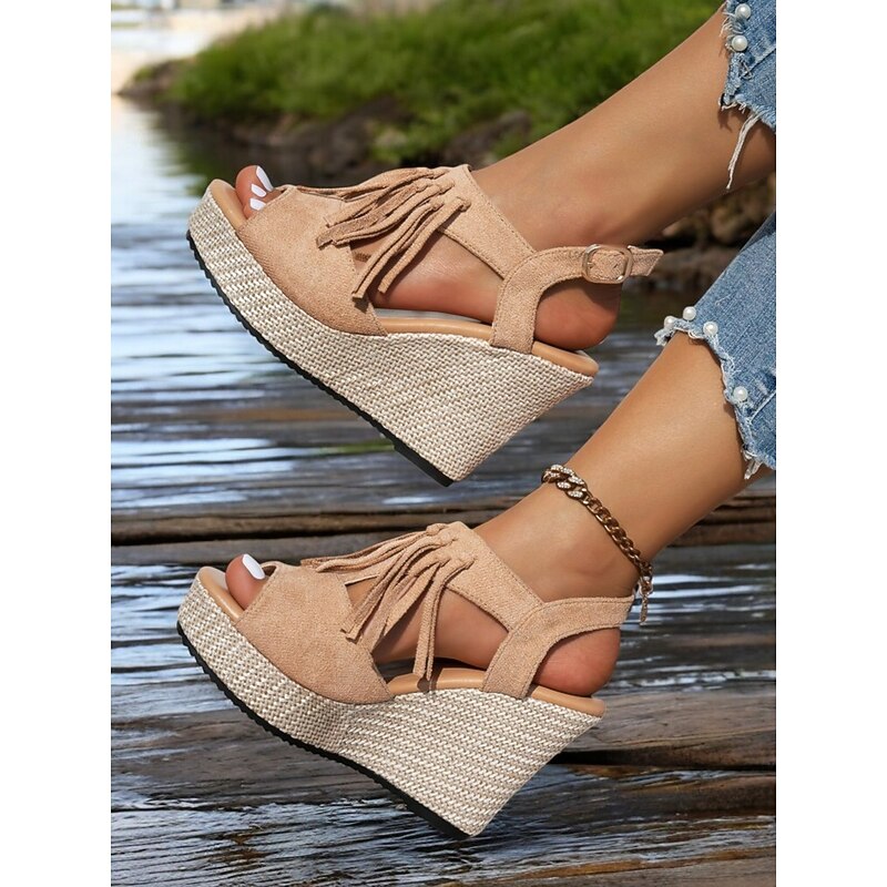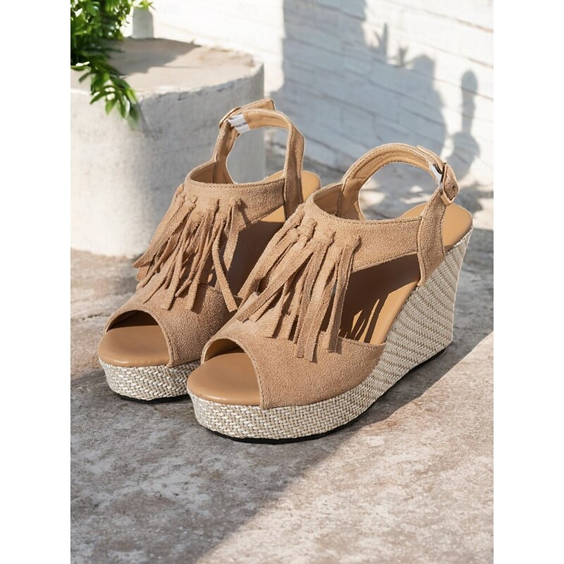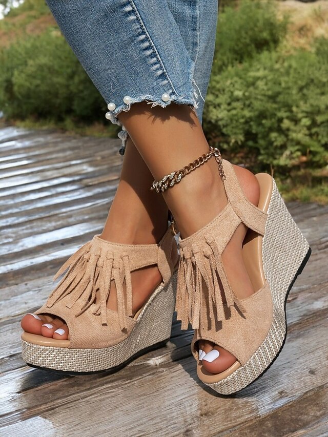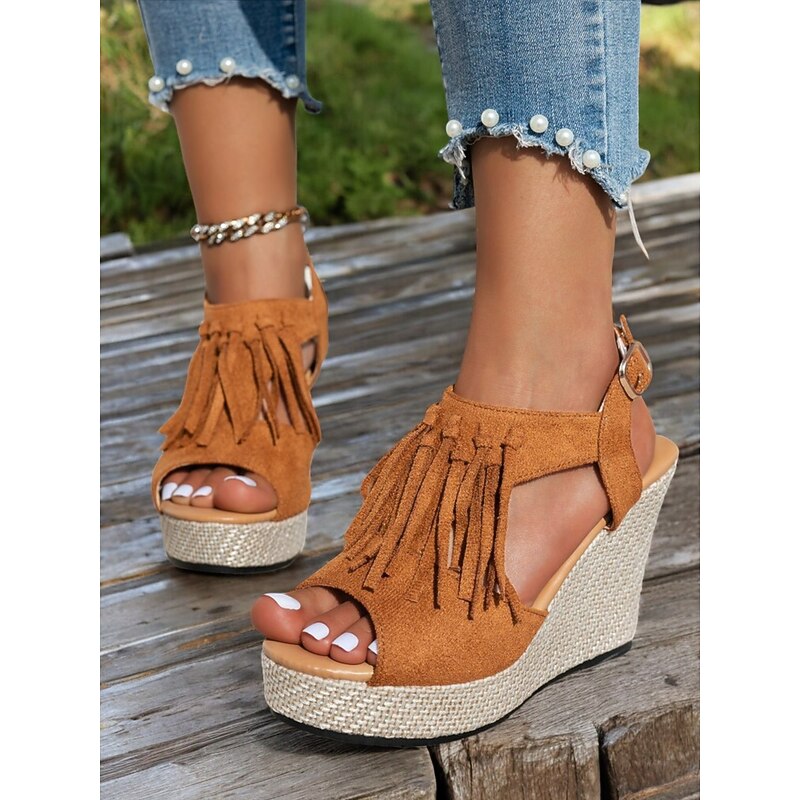 HOT ! Women's Fringe Wedge Sandals – Boho Peep Toe Platform Heels for Summer Beach Vacations, Casual Chic Outfits, and Festival Wear