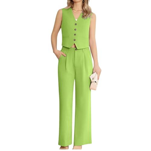 HOT ! Women's 2 Piece Suit Linen Casual Lightweight Button Front Vest Sleeveless V Neck Vest Jacket and Pants