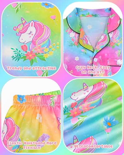 Sylfairy Girls Pajamas Silk PJS Set Rainbow Unicorn Sleepwear Short Sleeve Long Pants Jammies for Toddler Kids 6