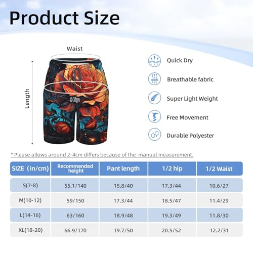 Boys Swim Trunks Beach Shorts Summer Surf Kids Youth Bathing Suits, Rose On Fire Burning Art Moon 5