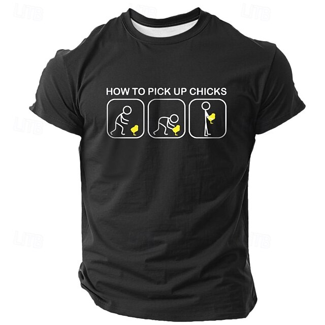 Highlights [Fabric] This Men's T-shirt is made from a high-quality polyester fabric, offering a combination of comfort, durability, and easy maintenance. The material is breathable, making it perfect for warm spring and summer days, while the micro-elastic properties ensure a comfortable fit. [Fit] Designed with a tailored fit, this T-shirt features a classic crew neck and short sleeves, providing a timeless athleisure style that's suitable for a casual yet refined look. The fit is ideal for everyday wear, ensuring ease of movement without sacrificing style. [Design Highlights] Featuring a humorous and eye-catching "How to Pick Up Chicks" 3D print, this T-shirt adds a playful element to your wardrobe. The vibrant white and yellow illustration on a solid background injects humor and personality into the design, making it a standout piece. [Occasions] Perfect for outdoor sports, streetwear, and casual settings, this T-shirt is versatile enough to suit a variety of occasions. Whether you're hitting the gym, hanging out with friends, or enjoying a summer day, this top offers both comfort and style. [Size Range] Available in a wide range of sizes, from S to XXXL, this T-shirt caters to diverse body types, ensuring a tailored fit for everyone.