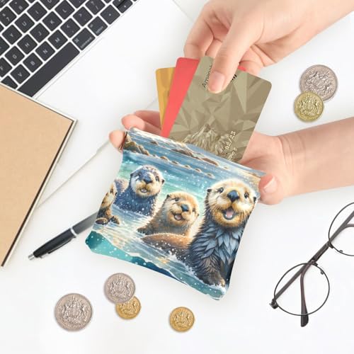 HOT ! Sea Otters Watercolor Coin Purse Leather Pouch Change Purse, Squeeze Coin Pouch for Cards, Keys & Lipsticks, Unisex