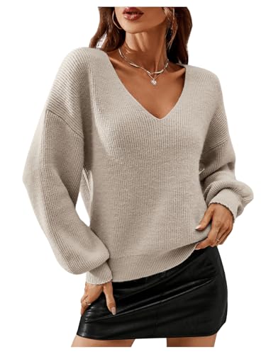 MakeMeChic Women's Solid V Neck Drop Shoulder Sweater Long Sleeve Knitted Pullover Casual Tops 1