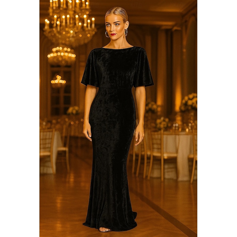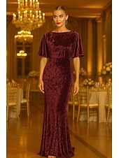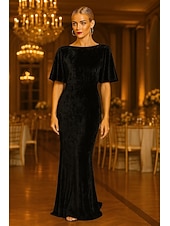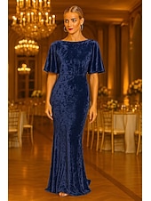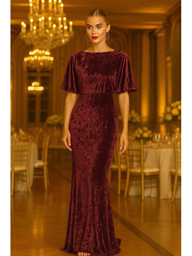 More information about Mermaid / Trumpet Cape Dress Evening Gown Textured Velvet Elegant Dress Formal Wedding Sweep / Brush Train Short Sleeve Boat Neck with Ruffles 2025
