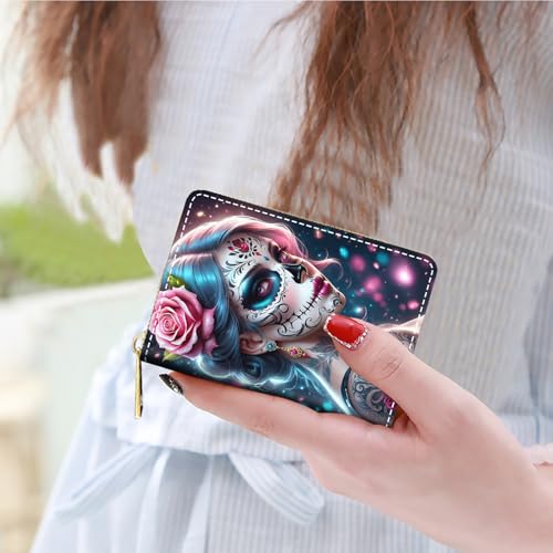 HOT ! Credit Card Holder Wallets for Women, Small RFID Wallet Slim Leather Card Organizer Case with Zipper, Sugar Skull Girl Flower