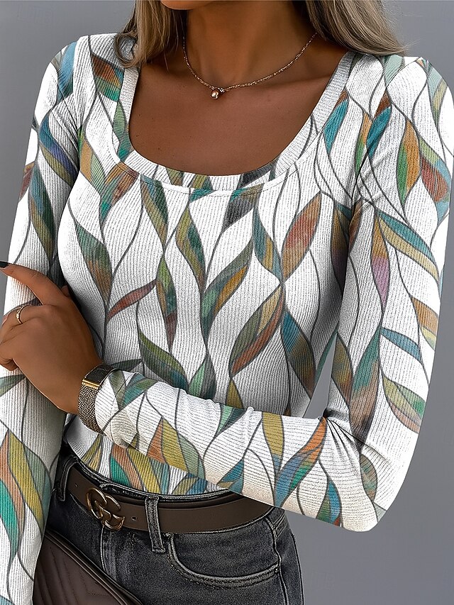 Women's T Shirt Ribbed Graphic Square Neck Long Sleeve Casual Floral Elegant Vintage Regular Tops Daily Going out Weekend Print White Light Green Red Blue Purple Spring Fall 13