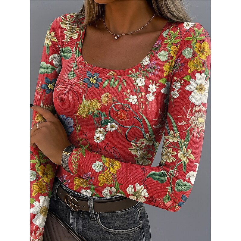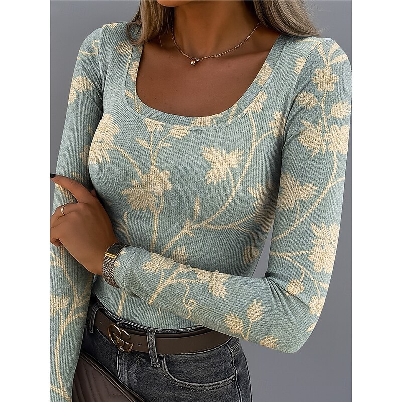 HOT ! Women's T Shirt Ribbed Graphic Square Neck Long Sleeve Casual Floral Elegant Vintage Regular Tops Daily Going out Weekend Print White Light Green Red Blue Purple Spring Fall