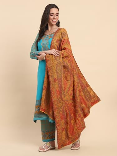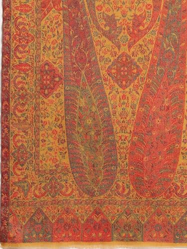• This kashmiri shawl has multi base in the center surrounded by yellow. The weaving of the floral and paisley design is done using cotton threads, which gives soft and smooth feel.