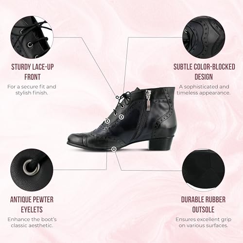 • Round toe, polished leather, durable waxed cotton laces, antique finished pewter eyelets, polished stacked heel.