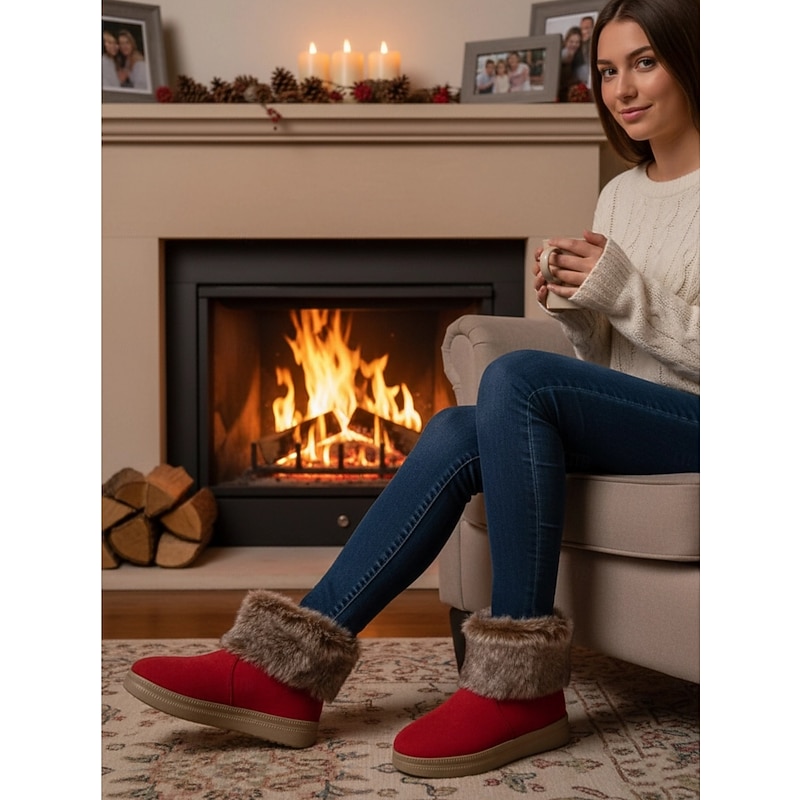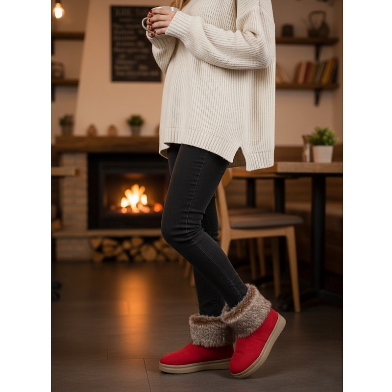 Highlights [Fabric] Crafted with a high-quality suede upper and lined with plush faux fur, these women's winter boots provide both warmth and a luxurious feel. The faux fur lining ensures cozy comfort, perfect for cold weather conditions. [Fit] Featuring a comfortable slip-on style, these ankle boots are designed for easy everyday wear with a relaxed fit that offers both style and practicality. [Design Highlights] The boots boast a vibrant red exterior accented by a natural brown faux fur trim at the top, adding a touch of elegance and luxury. The sturdy and ribbed rubber outsole offers enhanced grip and durability, making these boots suitable for diverse terrains. The chunky heel and platform design provide additional support and a contemporary edge. [Occasions] Ideal for daily wear during the fall and winter seasons, these fashionable and functional boots are perfect for a variety of occasions—from casual outings to relaxed gatherings. They seamlessly combine style and practicality, ensuring your feet remain warm and chic throughout the colder months. [Size Notice] Available in a range of sizes from US6 to US10.5, these boots cater to various foot sizes, making them an accessible and fashionable choice for many.