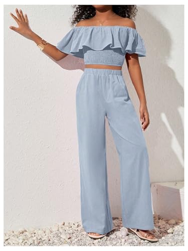 • Features: T shirt for girls, short sleeve, off shoulder, ruffle trim, shirred, slim fit, solid color, cropped length, casual