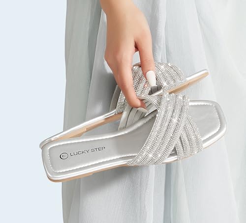 HOT ! LUCKY STEP Women's Rhinestone Flat Sandals Open Toe Summer Glitter Bling Sparkle Dressy Slip on Outdoor Crossed Strap Slide
