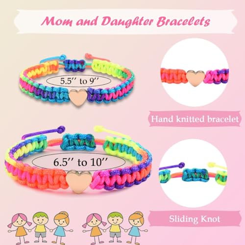 • Mother Daughter Bracelets: Hand knitted with colorful strings, these matching bracelets are durable and well made. The small one for daughter is 5.5 to 9 inches, the big one for mommy is 6.5 to 10 inches. They are adjustable with sliding knot, fit most wrists.