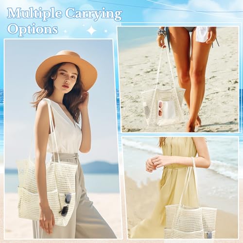 2 Pcs Mesh Beach Bags, 2 Sizes Causal Beach Bags for Women, Beach Tote Bag with Mini Pocket, Pool Bag for Travel (Khaki) 6