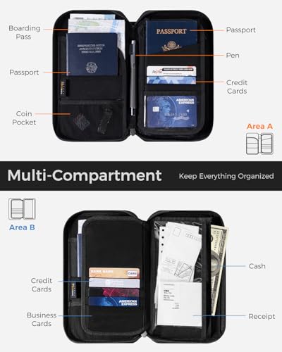 • All-in-One Organizer: 3 layers with 8 compartments neatly store travel documents, invoices, bills, coins, keys and more. Perfect for both business trips and family vacation — keep all your essentials in one bag. Size:9.3 × 5.3 × 1.1 in(23.5 × 13.5 × 2.8 cm)