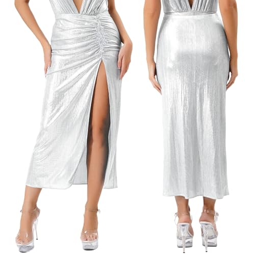Elastic Waist Shimmering Maxi Skirt for Womens Sequined Embroidery Side Ruched Slit Poolside 5
