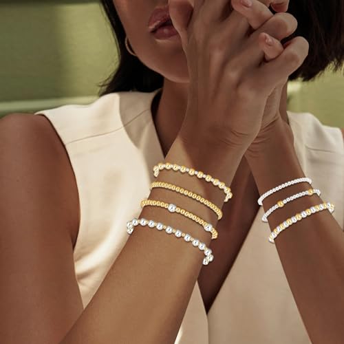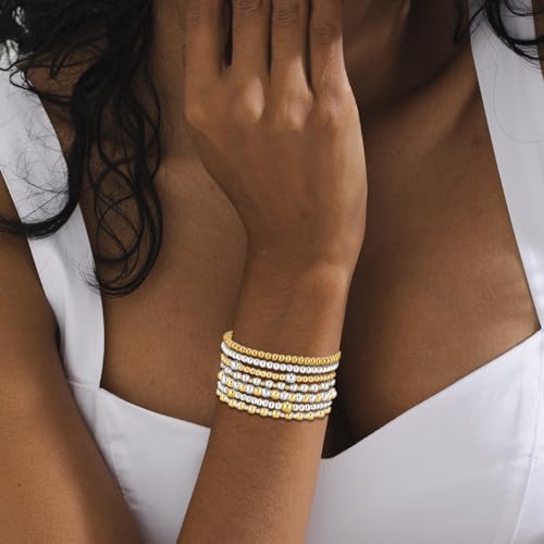 7Pcs Gold Bracelets for Women Gold Plated Beaded Bracelet Elastic Stretch Bead Ball Stack Set Stretchable Adjustable Gold Jewelry Gifts 7
