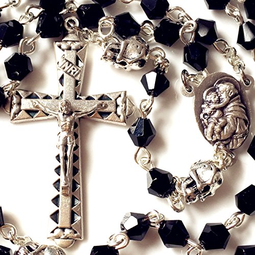 • elegantmedical HANDMADE silver skull Beads & black Crystal 5 Decade rosary cross crucifix Catholic Necklace Box