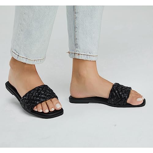 Stratuxx Kaze Women's Braided Strap Sandals Square Open Toe Slide Sandals Slip on Dressy Summer Beach Flats Size 5-11 6