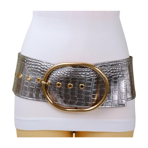 Women Silver Chrom Fashion Wide Belt - Hip High Waist Big Gold Oval Metal Buckle S M Metallic Pewter 5