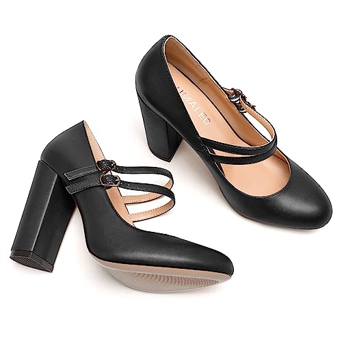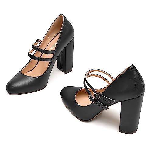 NUMALEO Womens Ankle Strap Round Toe Buckle Stylish Fashion Party Matte Block High Heel Pumps Shoes 4 Inch 6