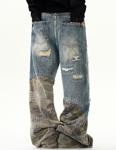 Mens Camo Ripped Jeans Y2k Hip Hop Camo Baggy Joggers Pants Streetwear Wide Leg Skater Jeans 1